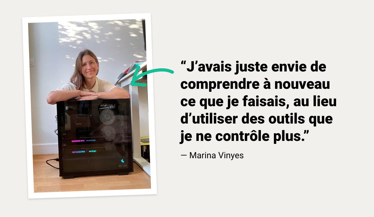 Cette histoire illustre parfaitement ce besoin croissant de reprendre la main sur ses outils. Marina Vinyes, ingénieure en IA passée par Criteo, a quitté un poste prestigieux pour créer son propre modèle de langage. Pas pour concurrencer OpenAI ;), mais pour comprendre à nouveau ce qu’elle faisait, sans dépendre d’outils devenus trop complexes ou opaques.