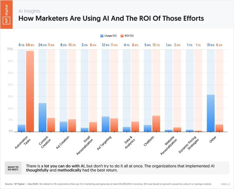 Selon plusieurs études récentes, l’automatisation affiche le meilleur ROI parmi les usages de l’IA. Une étude estime même que dans le marketing, on serait sur un ROI de 70 % en moyenne, loin des usages les plus répandus comme la génération de contenu.