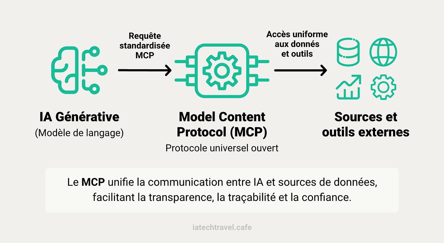 En résumé, MCP agit comme un traducteur universel entre une IA et les systèmes externes, et c’est ce qui permettra demain à vos propres outils métiers de dialoguer directement avec un agent IA.